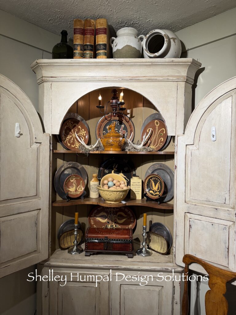 When I cleared out the corner cabinet of Christmas greens, it felt very bare and I see that I still have to pull the command hooks. Oops. I added in the antler shed from my daughter’s property, and set them on some Spanish moss.