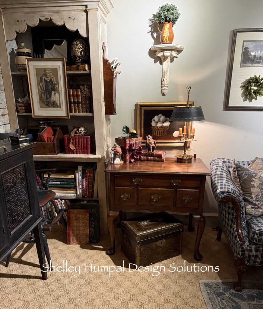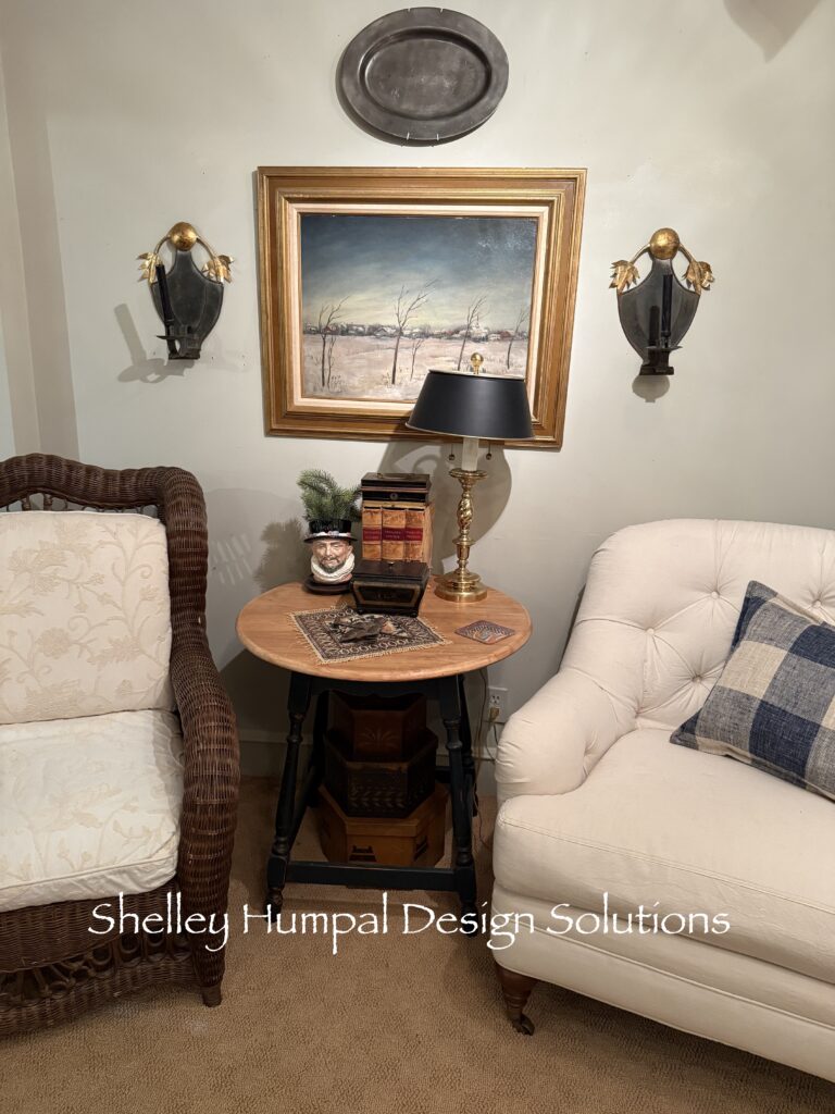 The lowboy that has been resting between these two chairs for quite awhile, and always seemed squished into this space. So I flipped the lowboy for the tavern table and it works quite nicely here. Funny how I never thought to do that before. Go figure!