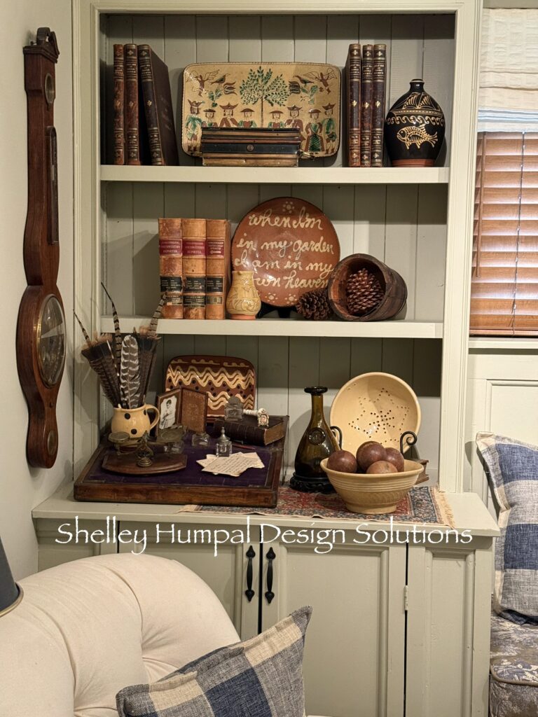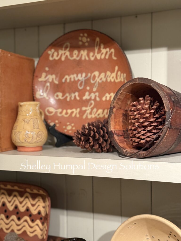 Nothing much changed in the bookcases from the holiday, except all the holiday decor was removed. On the middle shelf I decided to simplify and give the eye a resting place. Moved to the center of that shelf I placed a bundle of leather bound law books the red ware charger and my small wooden pail with a pinecone plopped in it. I like it.