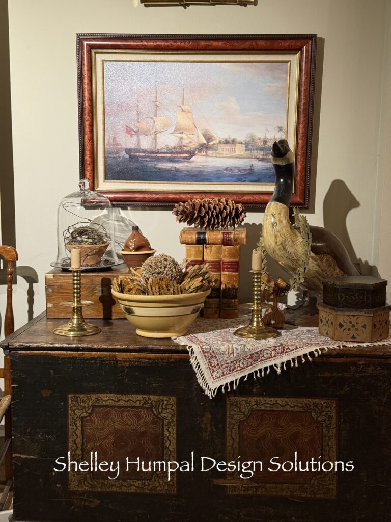 I had to rework the pie safe and I quite love it. My portrait got moved to this location because without the plates around it, the painting couldn’t hold the wall. He works nicely here. I love my PB lantern again with some smalls in it. Though I have had the lantern here before, it now has a watch box that my dad made, a small yellow ware bowl, that I’ve always loved with a pomegranate in it, and a bottle brush tree. The wicker tray has never been on the pie safe and it’s good. It’s so fun to bring things from upstairs to downstairs and breathe new life into them.