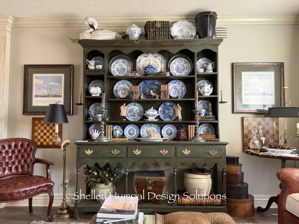 So here are some reflections on both the living room and the lower level room. In trying to embrace the blue sofa, the room was too fussy, for me. Too much going on with the transferware, and too much blue. Now the only blue down there is the sofa, and the toile cushion and pillows. The room feels more like me. I have to say I was surprised, and last year I was contemplating selling the transferware or the red ware, and moving on to something else. When I asked myself what I would like to collect, I had no answer. That tells me these collections are still right for me.