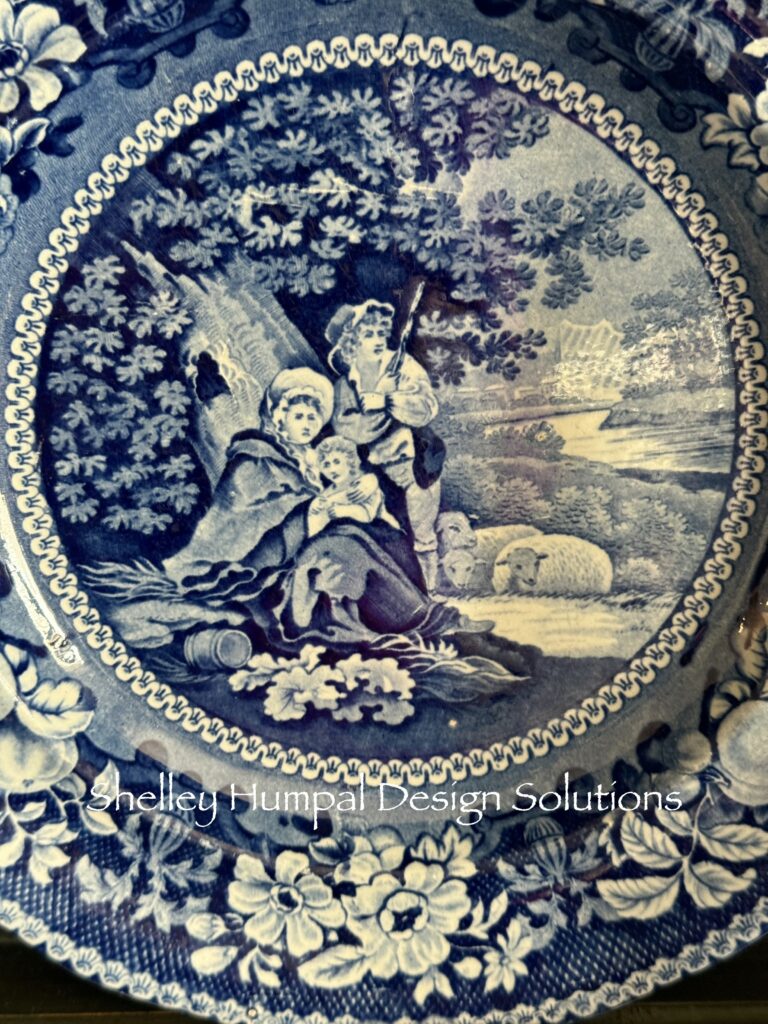 Sheltered peasants is First Period Transferware 1825-1835 so it is rare and very hard to find. For fun as I was reworking the cupboard, I opened my laptop and checked eBay. They had 3 plates. Two were in the $70 range but one was listed for 24.99. I said well this one has issues, but I couldn’t see anything wrong with it. As I explored the photos, I saw that it was chipped but, only on the back. You couldn’t see it from the front. I made an 18.99 offer to offset the 19.00 shipping and they took the offer, so I now have a Sheltered Peasants plate and I am so glad.