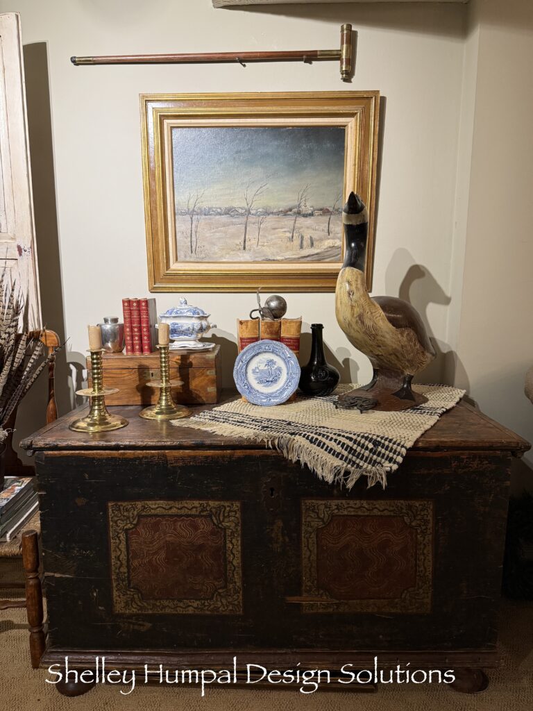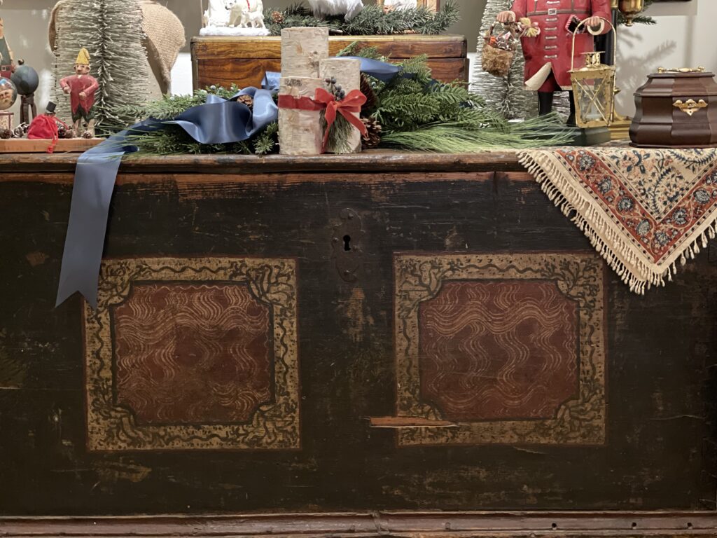 I found an old trunk at an antique mall in Fremont NE. It is primitive, complete with dry rot, bug runnels, missing lock box, I was in love. Pennsylvania German, early 19th Century, the large hinge straps had me at HELLO, though you can’t see them. I knew it would be perfect in the lower level for open storage. All my small trees are stored in there. Everyone thought I was strange in buying it. My mom thought so too. Still love it. Loaded with pretty things and primitive on the top it is one of those primitively elegant pieces.
