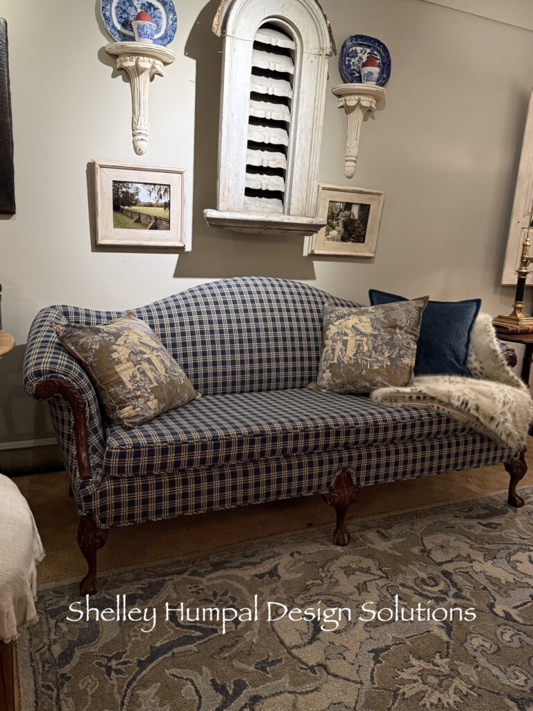 The first time I went to Williamsburg VA showed me where I wanted to be. In the Governor’s Palace a camel back sofa in a linen black and white buffalo check slipcover, spoke volumes to me. I was in love. In the 18th Century they often used lighter slipcovers in the summer. The homes would get so hot, and often these sofas would be covered in crewel or heavy damask. The 1920’s Chippendale style Kittinger Camelback sofa has gorgeous hand carving on the arm and feet but, done in a simple windowpane check, brings it down a step, so it’s not too formal. Of course all the scuffs on the feet give it the story of years and years of people, including myself running into those legs.