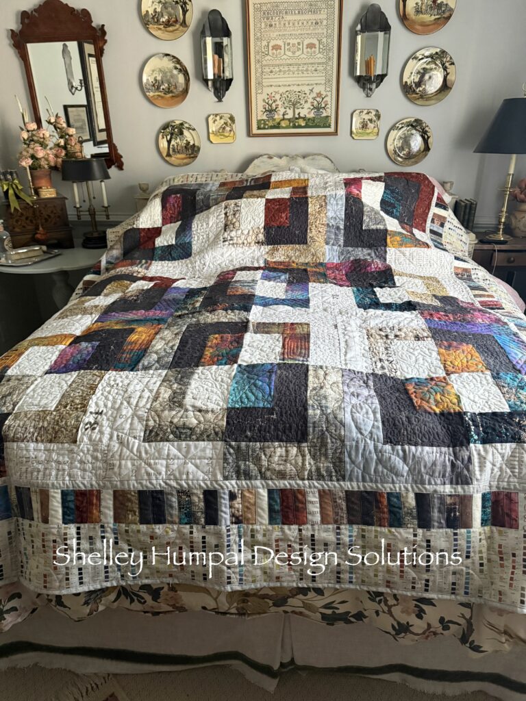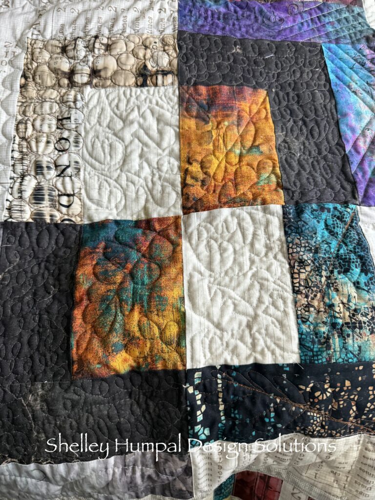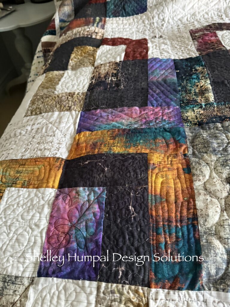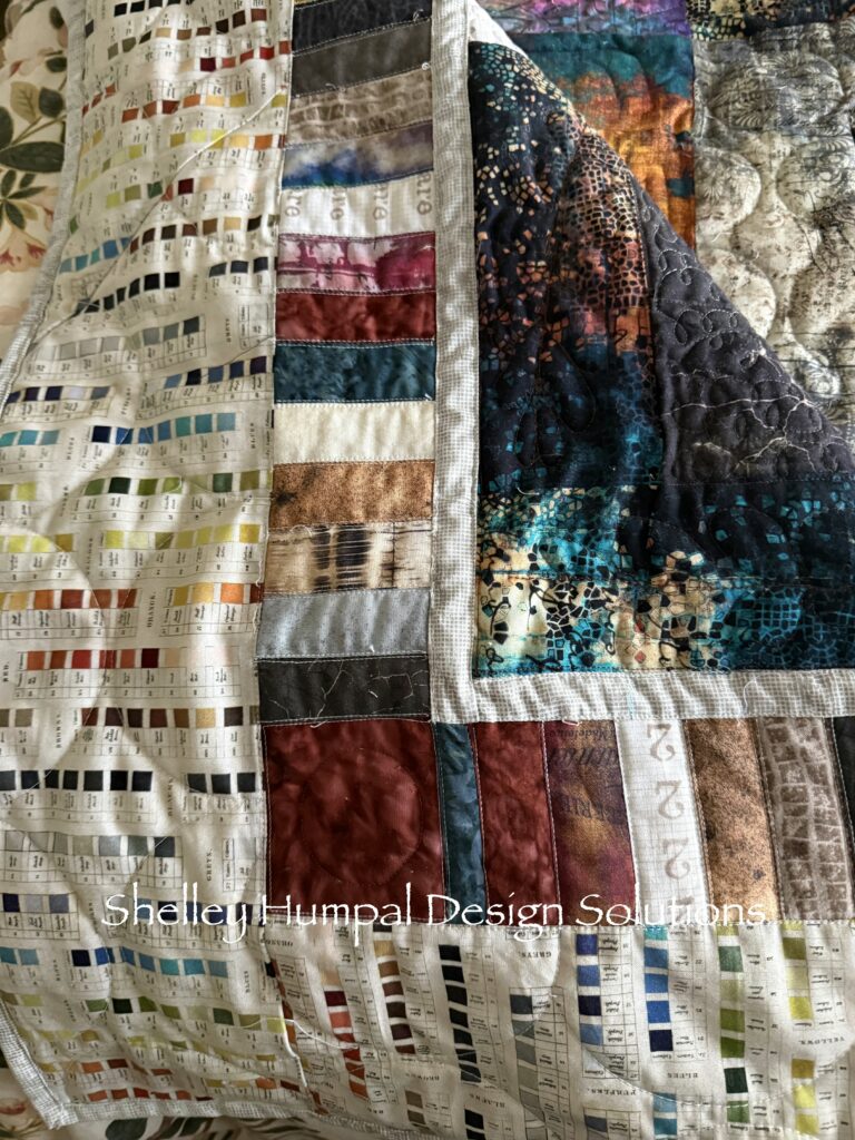 Finally motivated by getting stuff out of my hair, I managed to get a quilt done for my grandson. My grand boys are no longer boys but young men. This one will be getting his learner’s permit next year. Both are big boys. Very tall and G has out matched my 5’9″. So the quilt had to be made larger to accommodate him. It was a fun project, and I decided to quilt it myself to save on expense. Each rectangle got its own quilting pattern but it was a bit bigger than my machine could handle comfortably. Oh to have space for a long arm!!! Lots of twists and turns and folding!