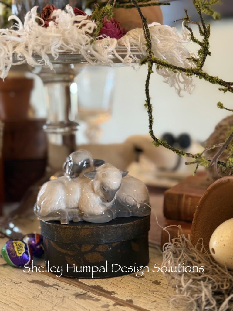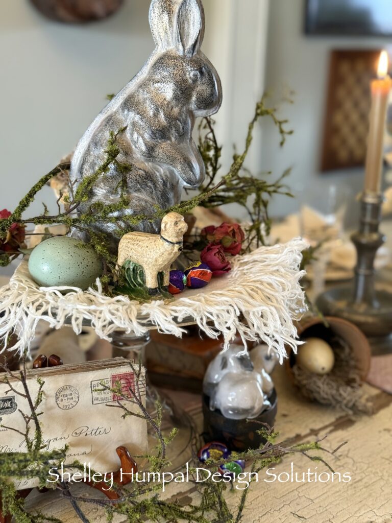 Next we added the glass cake stand. I don’t think it has ever seen a cake! With a fringed napkin to soften the edges it raises the centerpiece enough so I can actually do a centerpiece. The table at 29″ wide makes it a challenge to do anything interesting. Adding the tin bunny and surrounding him with spring, lambs, eggs, some dried roses, and of course Easter eggs, polish off the stand.