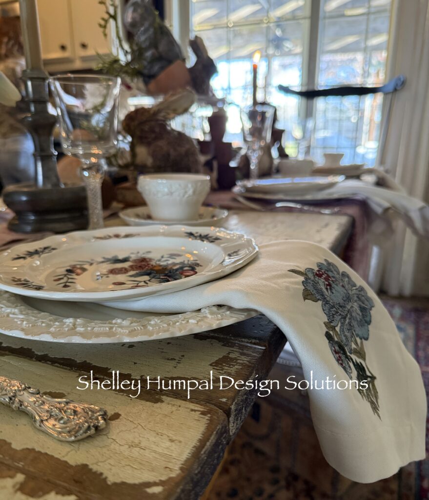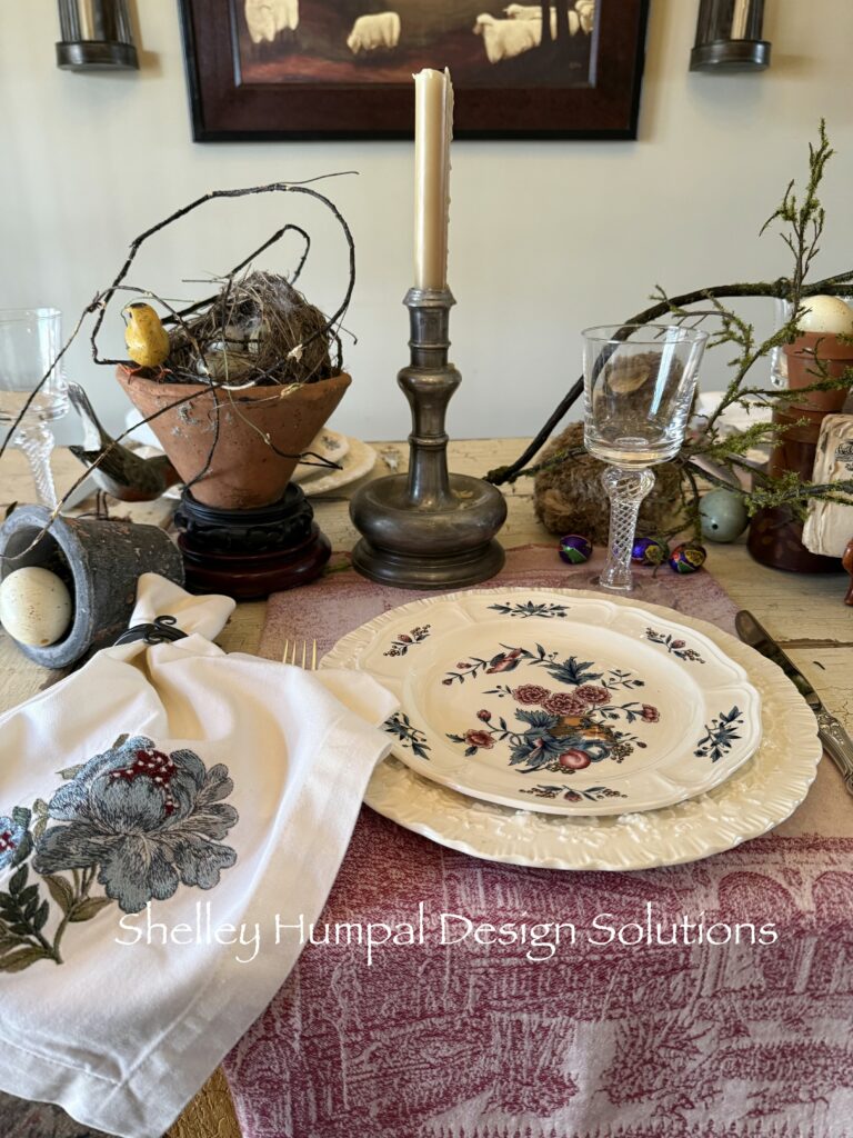 Starting with these wonderful tea towel’s I picked up many years ago at TJ Maxx, I haven’t used them in years but, I love the way they work with the Wedgwood Williamsburg Potpourri. Dishes purchased when I was 18! I still love them. The dinner plate is also Wedgwood from my mom. Cream on cream with an embossed edge. Just beautiful.
