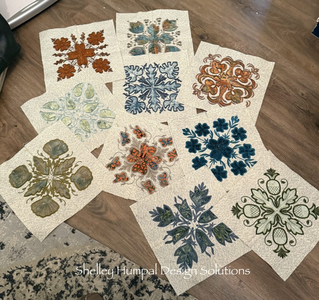 I wanted to learn how to machine embroider larger designs, in the confines of my Bernina 570, so I am taking a class and making a Hawaiian wall hanging. The sample is all bold bright colors on a white background, which I don’t do. So, I reimagined it, and I am liking the results. There are 4 corners that you appliqué and embroider in the hoop. Then you take the 4 corners and stitch them together to make a larger design. Each square will finish at 10″ and there are 12 squares total. After all of them are complete I am going to put a 4″ banding in between each square and then I will build some borders. Challenging for sure and I have decided to let it evolve. One decision to the next, will hopefully lead to the right solution. I am making it for Florida. After telling her about G’s quilt she said, well I want one. I was shocked! So stay tuned.