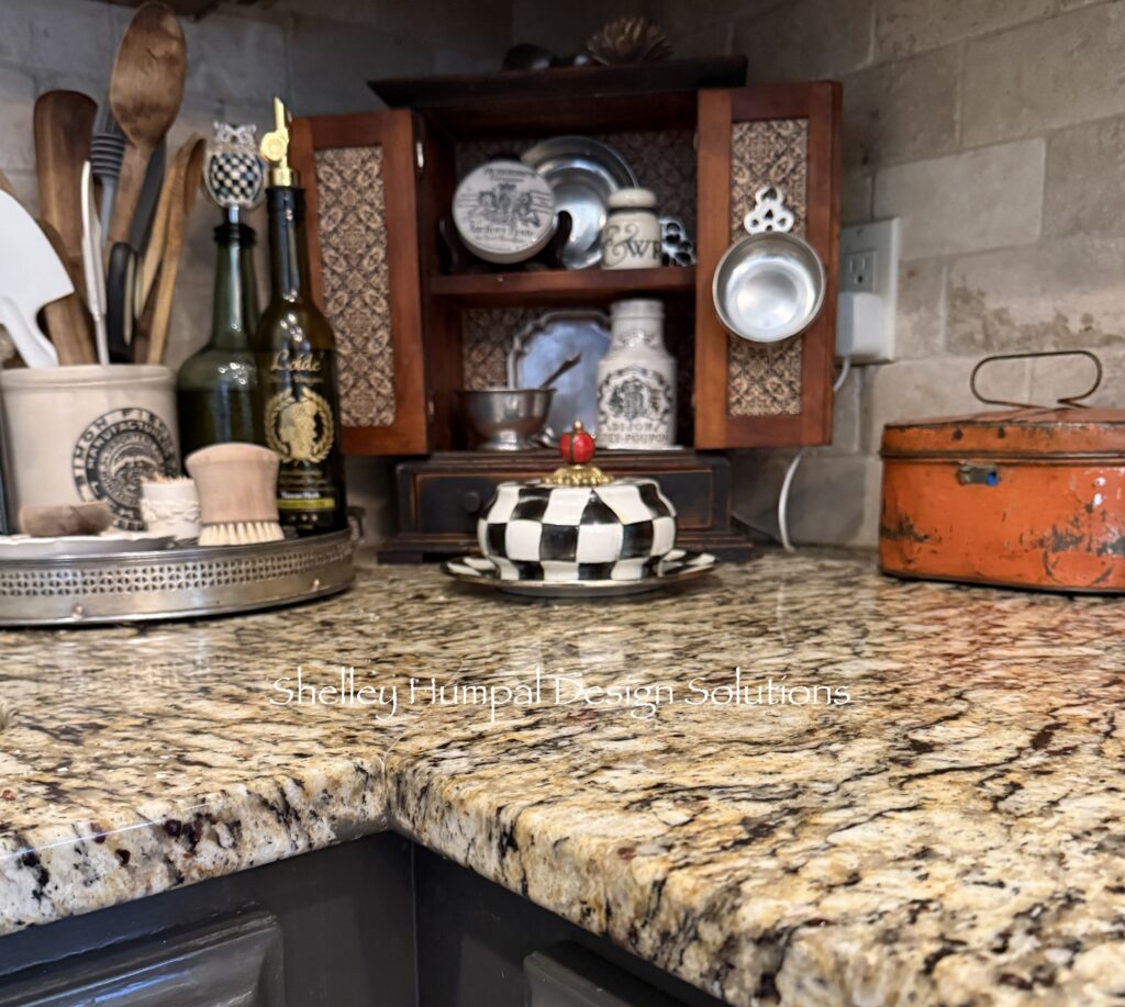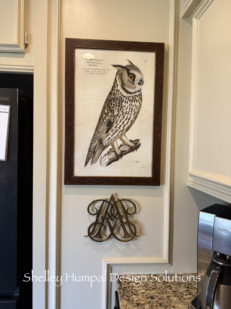 This handsome owl I picked up at Monticello right after I had added the granite countertops. I loved the play. When we added the picture frame molding to the kitchen, he was a bit big for the space. Now I feel like it doesn’t matter, I still like him there.
