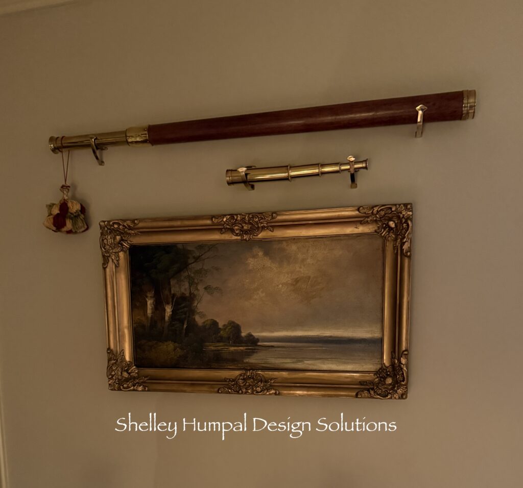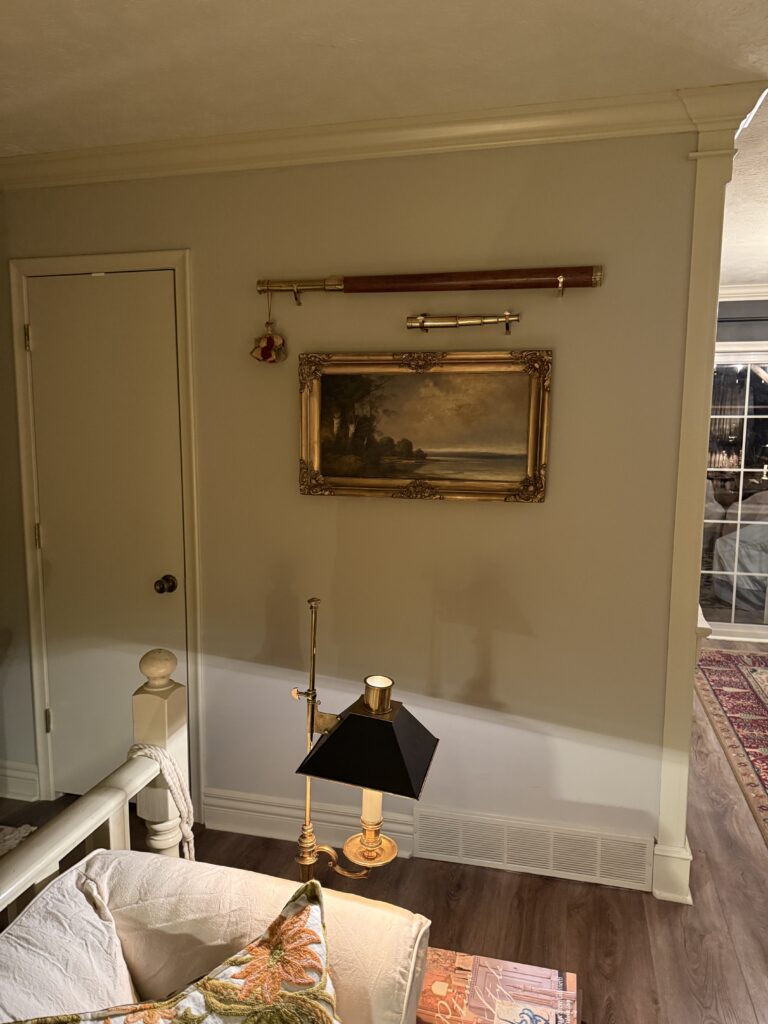 I thought it would go downstairs in the LL room but after trying it in a few places it just wasn’t the right vibe for down there. That frame again! So it ended up in the living room where my other painting rested, Approaching Calcutta. It is now downstairs. This painting is a bit small to hold the wall, and I’m not satisfied with the arrangement yet but, I’ll figure it out eventually. It does need to be cleaned but, there is something about the muddiness, that appeals to me. I took a piece of white bread to it and it did come away with a bit of residue without harming the painting. I have a picture light which it definitely needs but, I haven’t gotten to it yet.