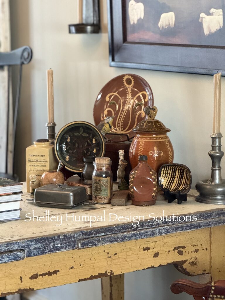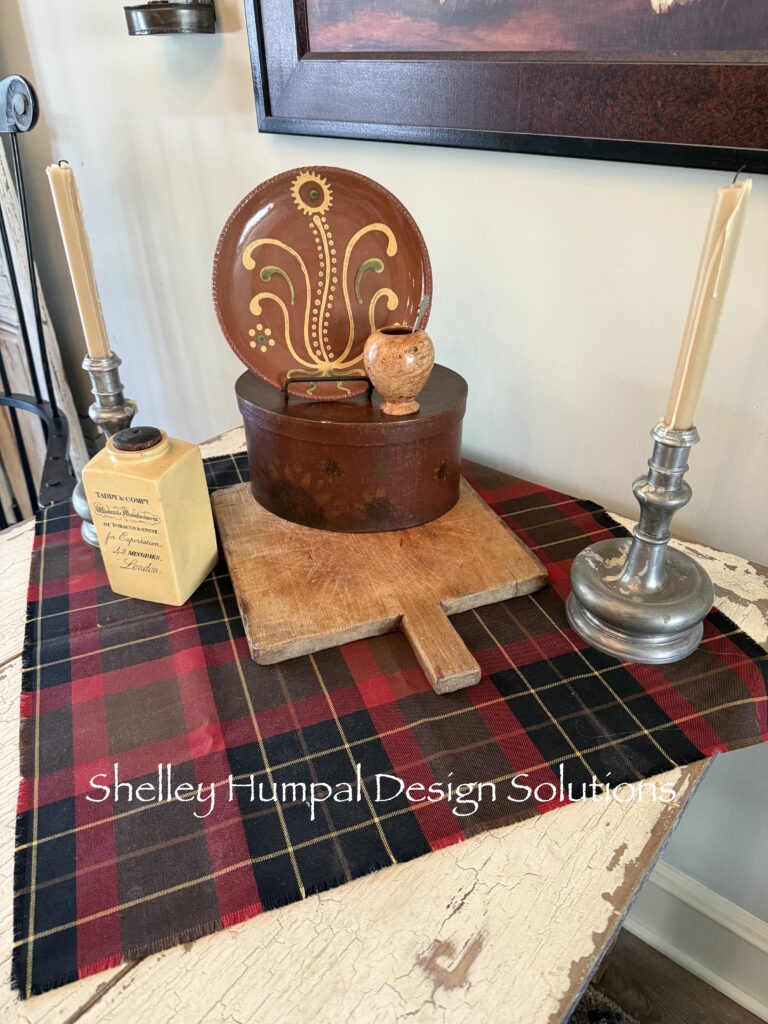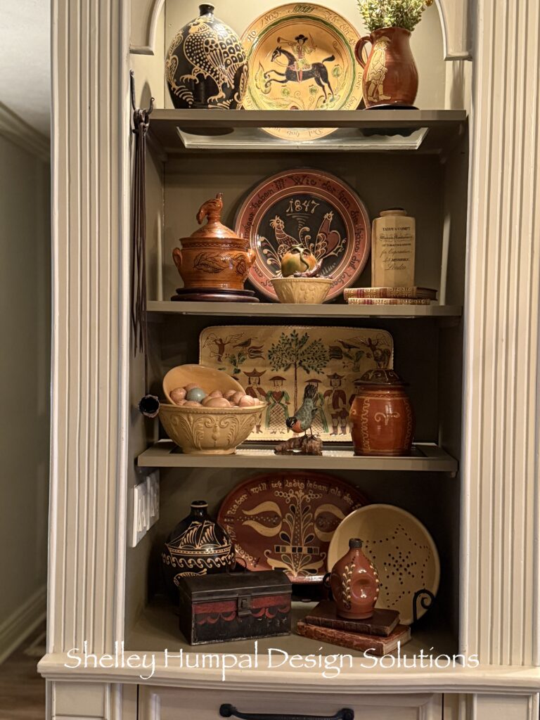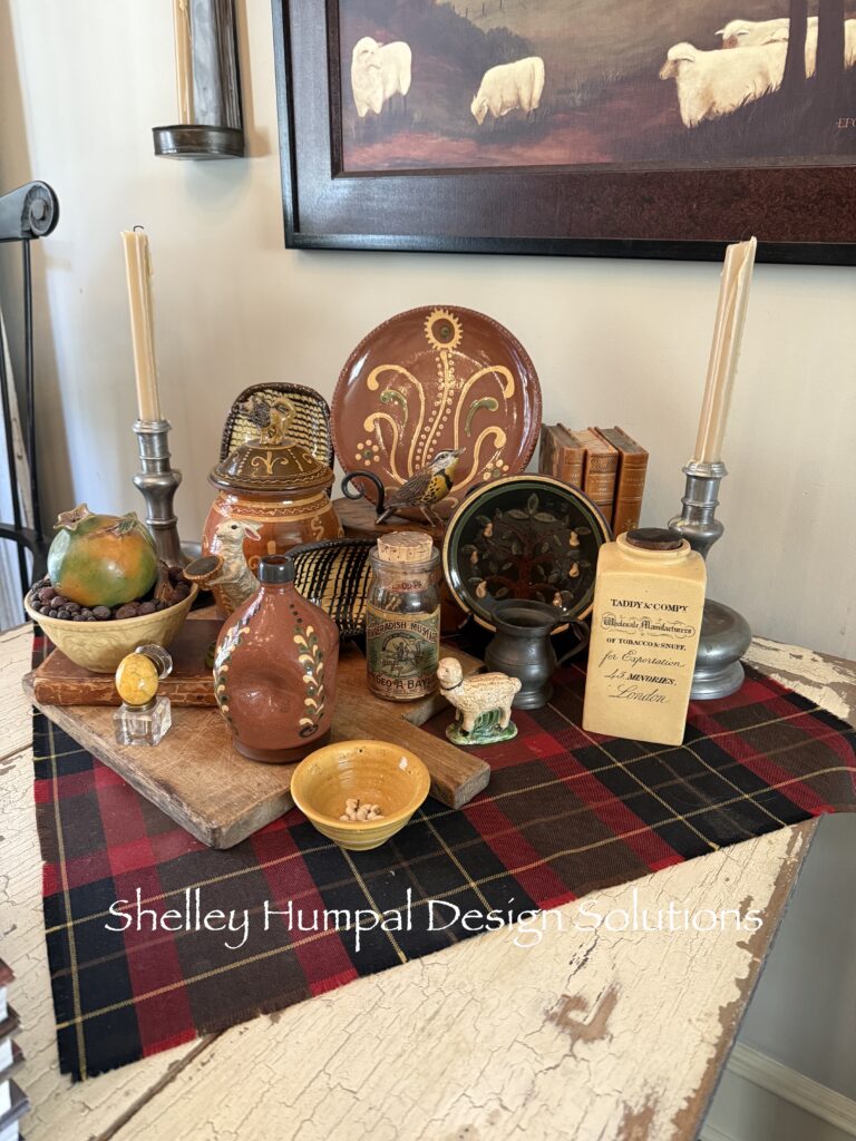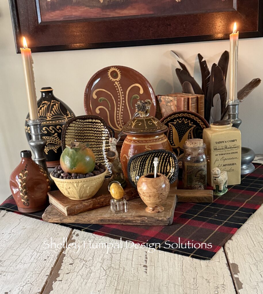 I was trying to figure out how to do a fall refresh, so I pulled out the Redware pieces I wasn’t using. What I had left was mostly smaller plates. I knew that wasn’t going to be enough to make a very interesting vignette, I needed to capture a few of the better pieces from the cubby.