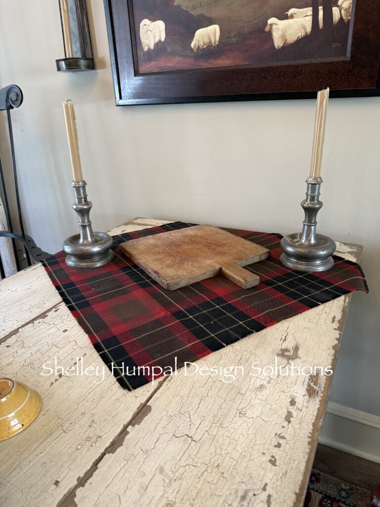Above is the photo that determined the box was too tall. The plate on top became separate from the rest of the grouping. I also felt that a bit of fabric would be nice to soften the edges. Time to regroup. I went in search and came up with a square of Ralph Lauren wool plaid. Usually reserved for the holidays I thought it might work here placed on the diagonal.