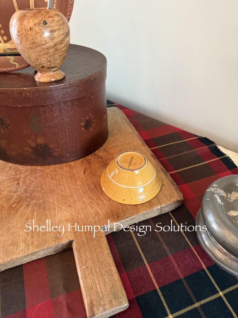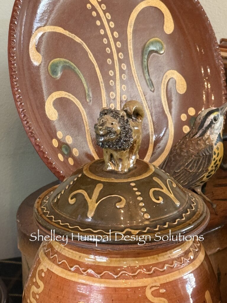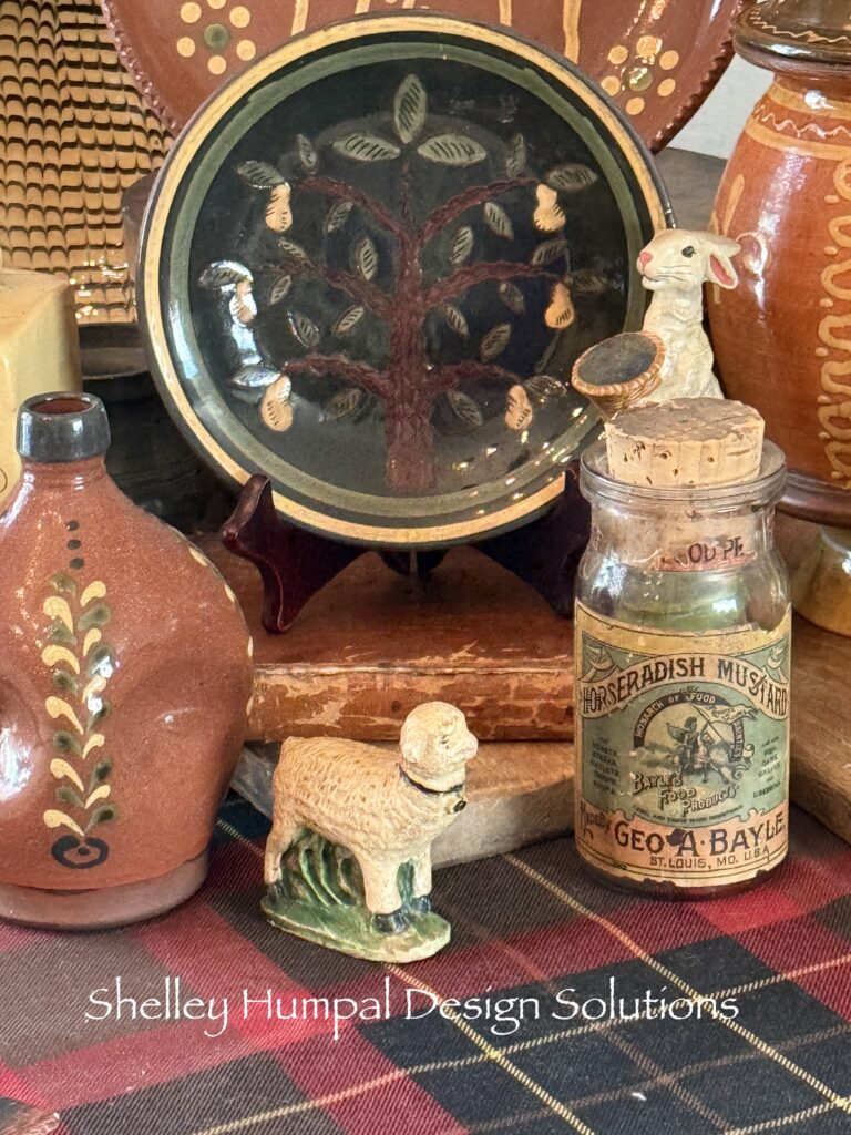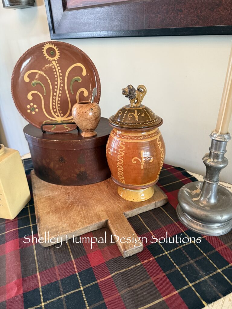 Left without my usual props of pedestals, and easels, I had to get creative with things to give objects a lift. I tried this little bowl as a lift for my favorite Redware Biscuit Barrel. A piece I picked up in Williamsburg in 2012. I spied the barrel coming down the stairs of a shop and walked up to it and handed it to the sales clerk. Didn’t even check the price!!! I said to myself “oh you are going home with me”. Ship it please! Still one of my favorite things.