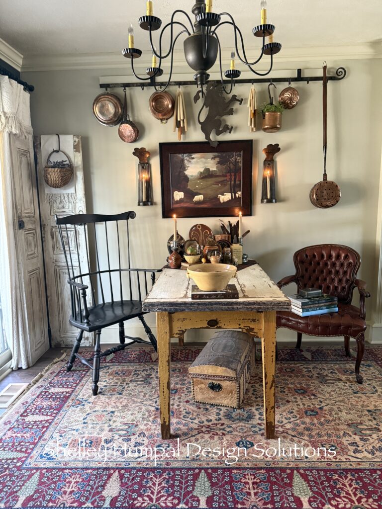 With a book, bowl, and small trencher (the yellow piece with the diagonal stripes) and the beloved biscuit barrel, now on the cutting board; of course my little marble egg on an ink well, and a new little treen ware vessel, counterbalanced against the table square I felt it was good. Then the left and right sides behind the candlesticks, were still bothering me. The trencher didn’t have enough volume and the books were too low. I swapped the trencher for an Ovid shaped jug from the cubby, and added a book underneath the books to raise those up. Some turkey feathers in a mug added texture. A tweak and a shuffle, NOW we’re done!