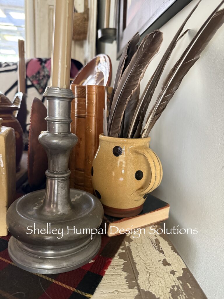 But wait, there’s more!!! Working at the thrift shop on Monday, I walked the floor, making sure there were no hidden treasures. What’s this, a redware pitcher with yellow glaze and black spots. Oh, well that would work better for the turkey feathers, and at 5.00 I couldn’t leave it behind.