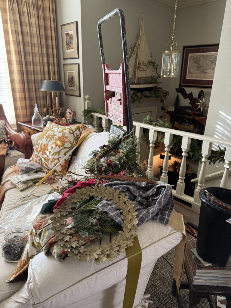 While preparing to deck the halls this year, I had an aha moment. What if they became Christmas pillows. Taken out just for the holiday. Removing the skirt I now looked at it from a fabric standpoint. The skirt had only one seem, certainly a plus for me. Allowing me enough to get 2 matching pillow fronts from the skirt.
