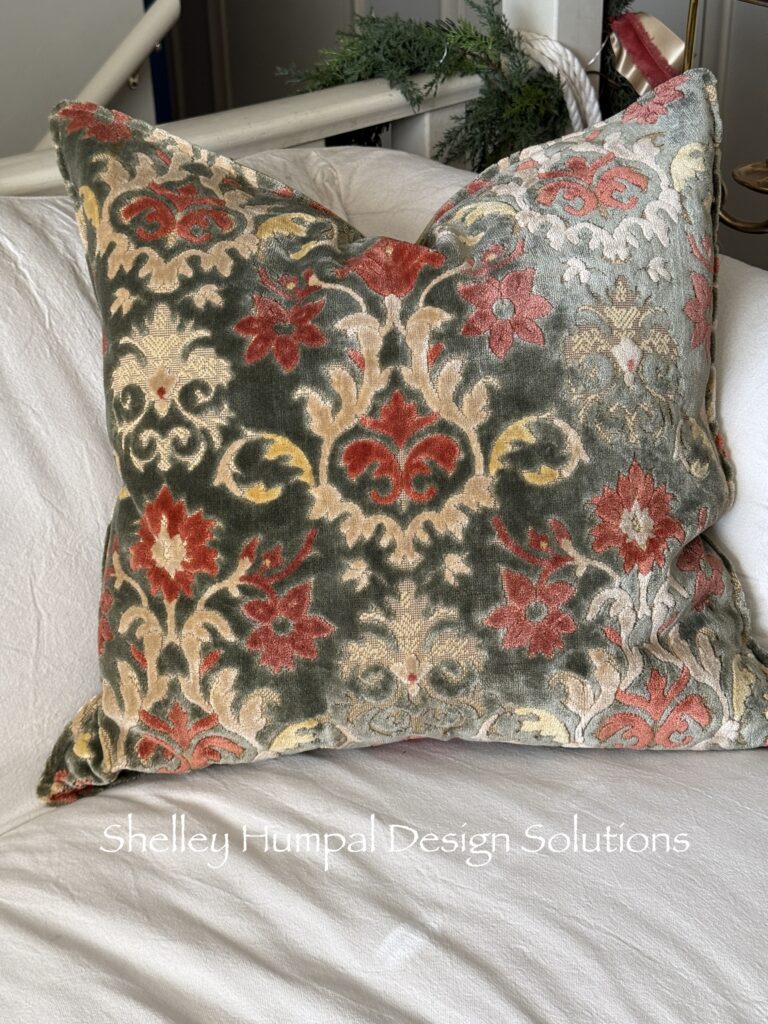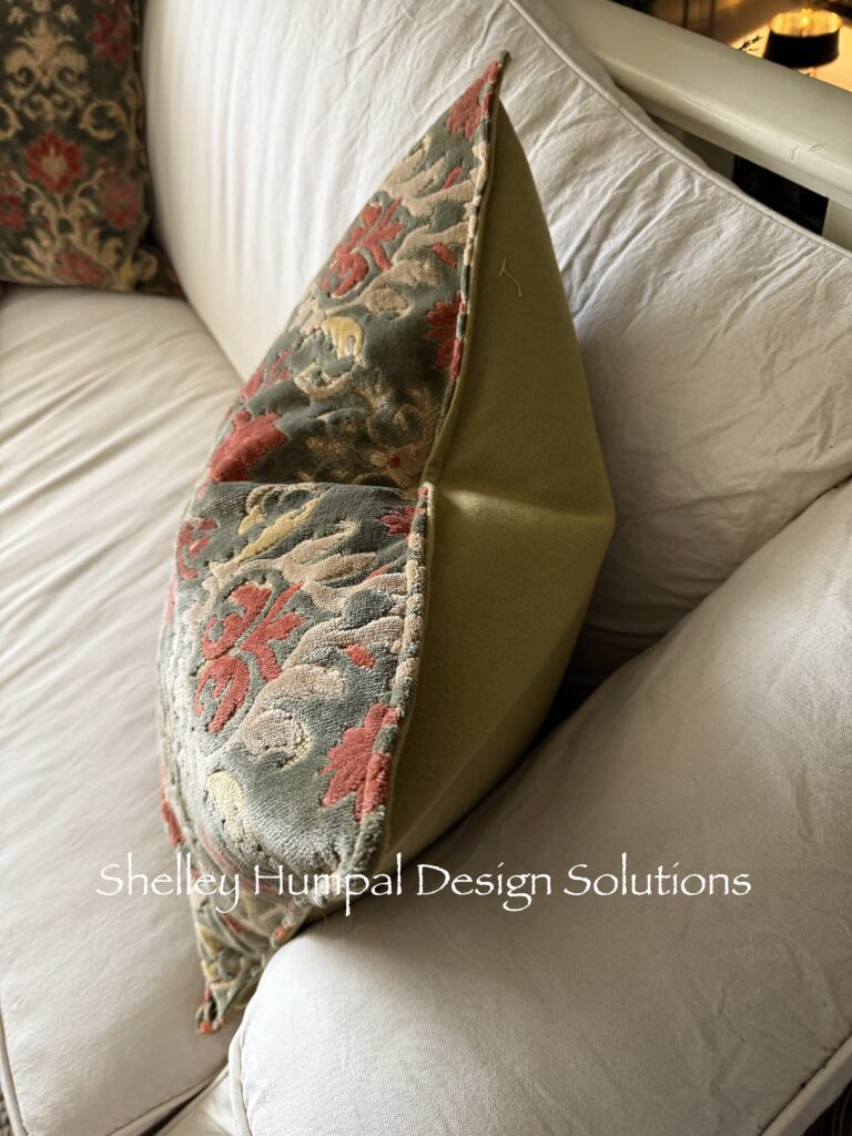 These pillows are part of that. While breaking down my parent’s family home, I came across a skirt of my mom’s. I remembered this skirt from childhood Christmas’ past, and knew I would not part with it. This skirt was heavy. An upholstery weight cut velvet made when fabric was beautiful in every way. The depth of color, the contrast and shading from beige to gold. The richness of the greens and corals. To touch this fabric you immediately feel the quality, the peaks and valleys, the softness of the velvet. It hits you with all your senses. Well maybe just me!