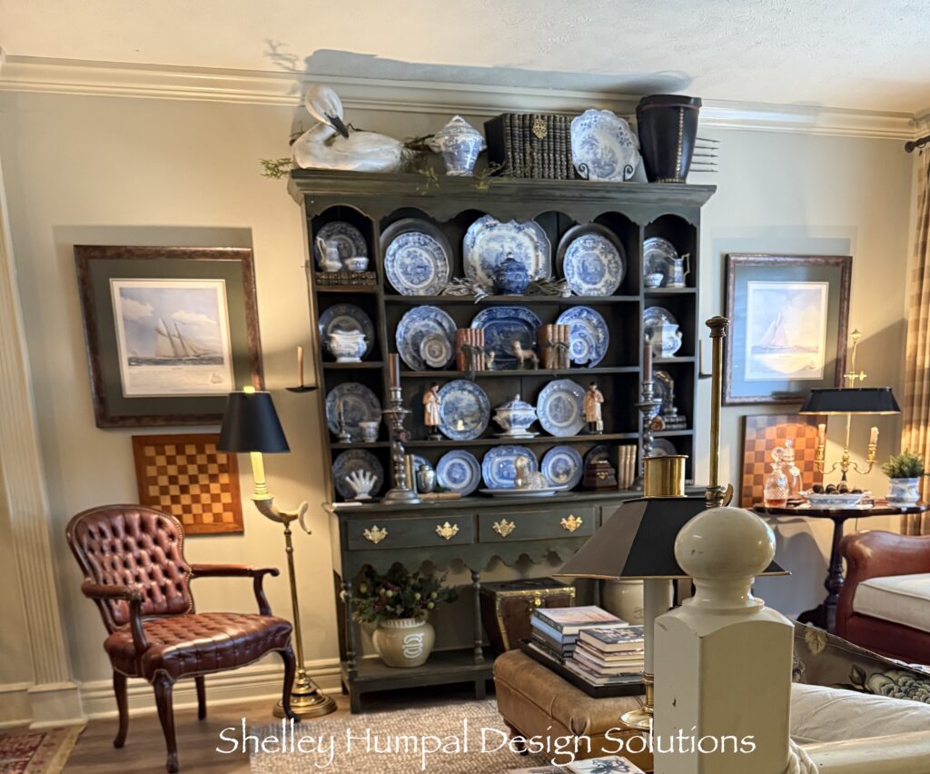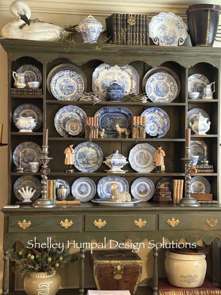 After getting most of the upstairs decor down, I had to decide what to do with the Welsh Cupboard. Always the focal point, I had to rethink the cupboard, as well as the cubby and the kitchen table. With the red ware on loan to the lower level, I decided to bring up the blue and white transferware, to the cupboard. After spending many, many years downstairs I brought it back up.
