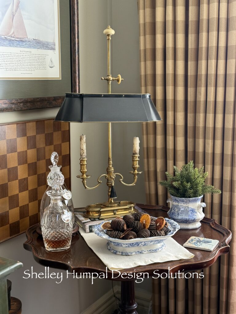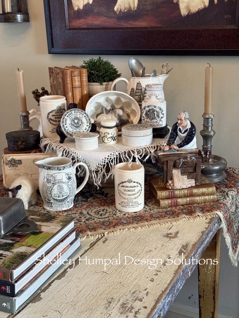 The cubby got all the Doulton Lambeth Pubware. I’ve never used it in there and with the introduction of some pewter and wood pieces I quite like it. It’s all about the shadows!